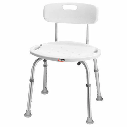 The Adjustable Bath & Shower Seat With Back can be used in a shower stall or bathtub. The seat is constructed of durable plastic with easy-to-grip handles and a notch to hold a hand-held shower spray. The aluminum legs are flared to help prevent tipping and the slip resistant rubber tips provide added stability.