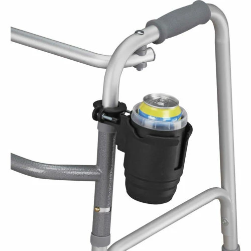 - This convenient cup holder attaches easily to most walkers, wheelchairs and bed rails