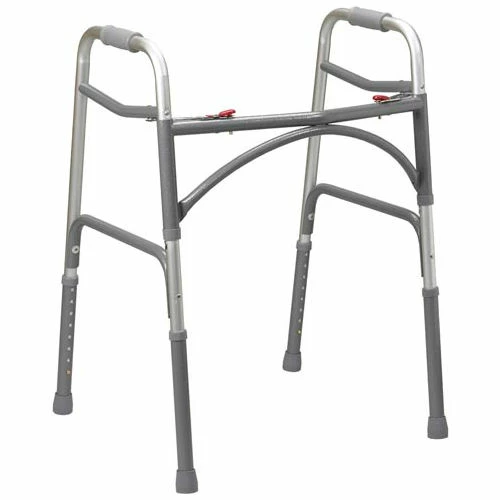 The Bariatric Aluminum Two Button Folding Walker by Drive Medical now comes in a wider and deeper frame designed to accommodate individuals up to 500 pounds. The precision design provides additional strength while adding minimal weight to the walker. The “U” brace, steel legs and side brace ensure security and stability. Limited Lifetime Warranty.