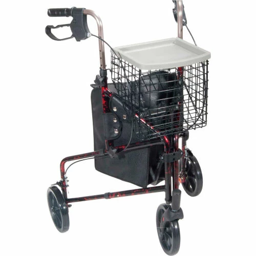 This 3 wheel rollator in blue has a lightweight aluminum frame and comes standard with basket, tray and pouch. Easy one hand folding makes for simple storage. Easy to adjust handle height with self-threading knob. Lightweight solid 7.5″ wheels for indoor and outdoor use. Comes standard with special loop locks made of internal aluminum casting to ensure safety.