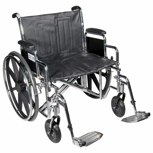 The Sentra Extra Heavy Duty Wheelchair from Drive Medical boasts a 500 pound weight capacity, made possible through the use of reinforced steel gussets, heavy gauge reinforced naugahyde upholstery, reinforced side frame, caster journals, and dual cross bars. The stylish triple coated chrome frame, made of carbon steel, adds a touch of elegance to this bariatric wheelchair. Available in various arm styles and seat widths, the right wheelchair exists for you.